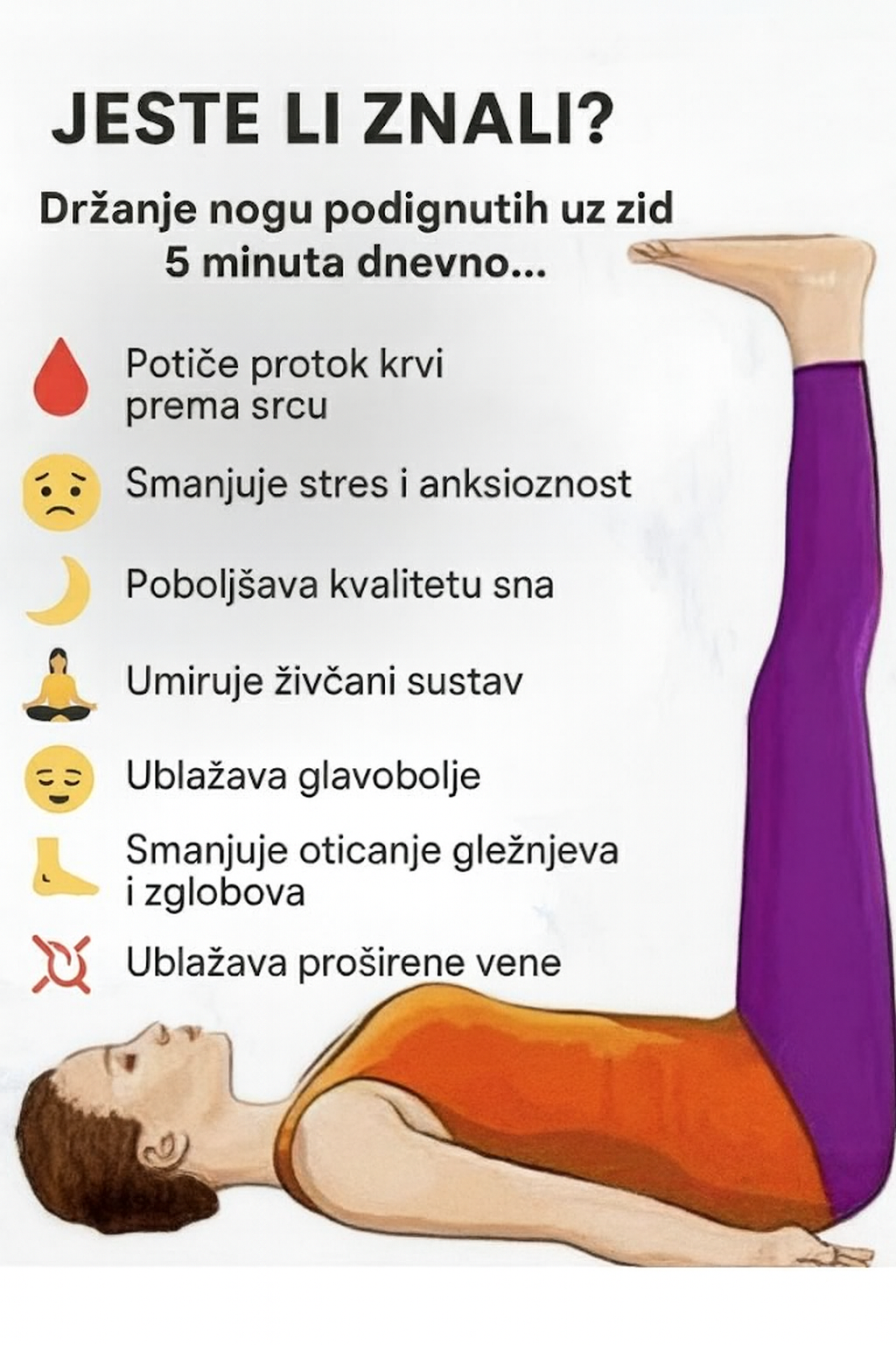 Ponekad najjednostavnije vježbe donose najveće olakšanje. Jedna takva jednostavna i učinkovita wellness navika je ležanje na leđima i odmaranje nogu uz zid samo 5 minuta dnevno. Ovaj blagi položaj, često preporučen u jogi i terapiji opuštanja, nudi višestruke fizičke i mentalne zdravstvene prednosti – bez ikakve opreme ili napora.