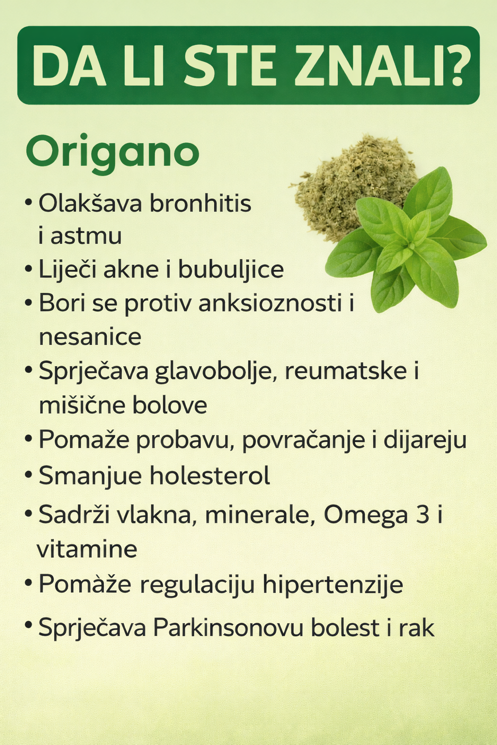 Origano je drevni lijek koji i dalje pokazuje svoju moć u modernoj prirodnoj medicini. Bilo da se radi o poboljšanju probave, jačanju imunološkog sistema ili ublažavanju stresa, ova skromna biljka može napraviti veliku razliku u vašem svakodnevnom blagostanju. Da li već koristite origano u svojoj svakodnevnoj rutini? Recite nam o svom iskustvu u komentarima!
