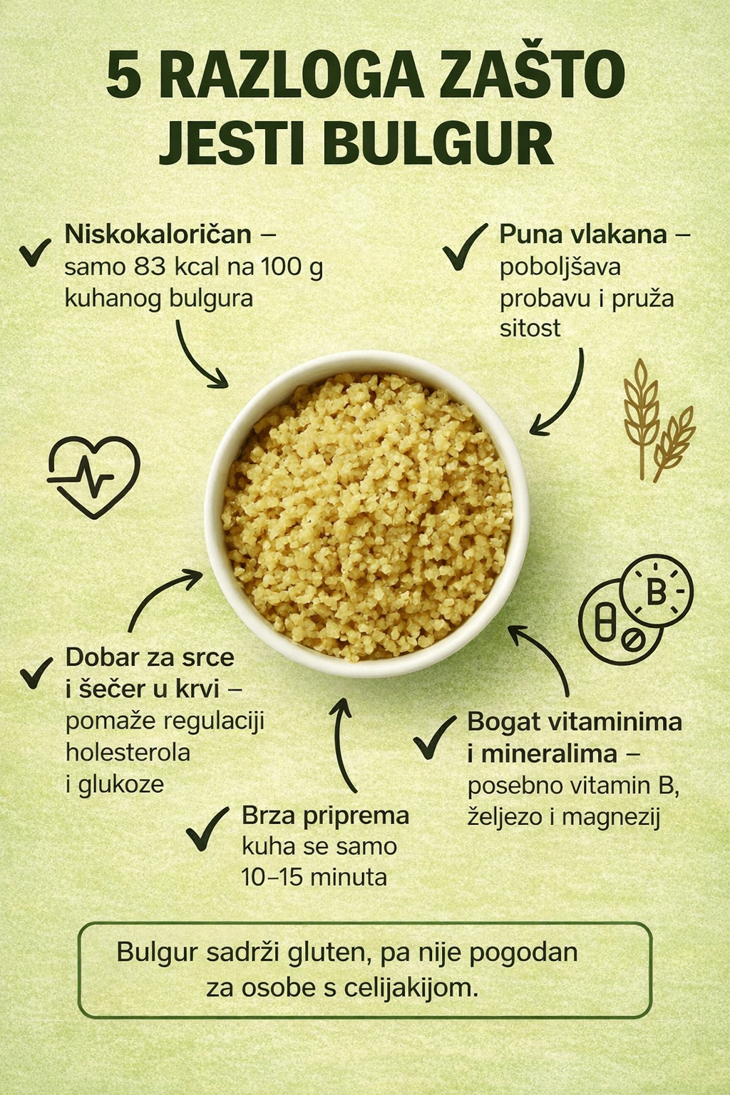 Bulgur je jednostavan, zdrav i ukusna namirnica koja donosi mnoge beneficije organizma. Iako sadrži gluten, njegova nutritivna vrijednost, bogatstvo vlakana i minerala čine ga odličnim izborom za sve koji žele poboljšati svoju ishranu. Brzo se kuha, lako se uklapa u različita jela i pruža dugotrajan osjećaj sitosti.