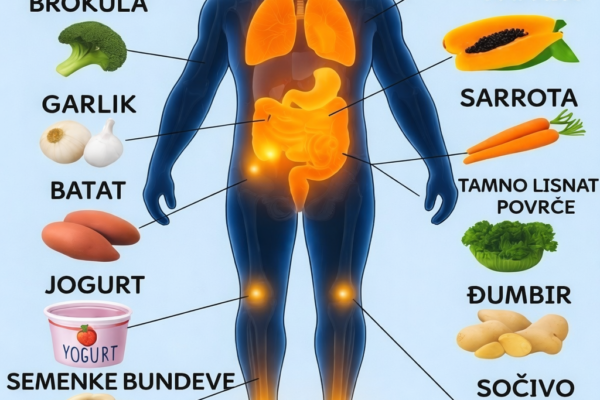 AgrumiPrepuni vitamin C, agrumi narandži, limuna i limete povećavaju proizvodnju bijelih krvnih zrnaca – vitalnih za borbu protiv infekcija. BrokulaBogata vitaminima A, C i E, kao i vlaknima i antioksidansima, brokula je jedno od najzdravijih povrća koje možete uključiti u svoje obroke. Bijeli lukBijeli luk sadrži alicin, spoj koji poboljšava imunološku funkciju i pomaže u…