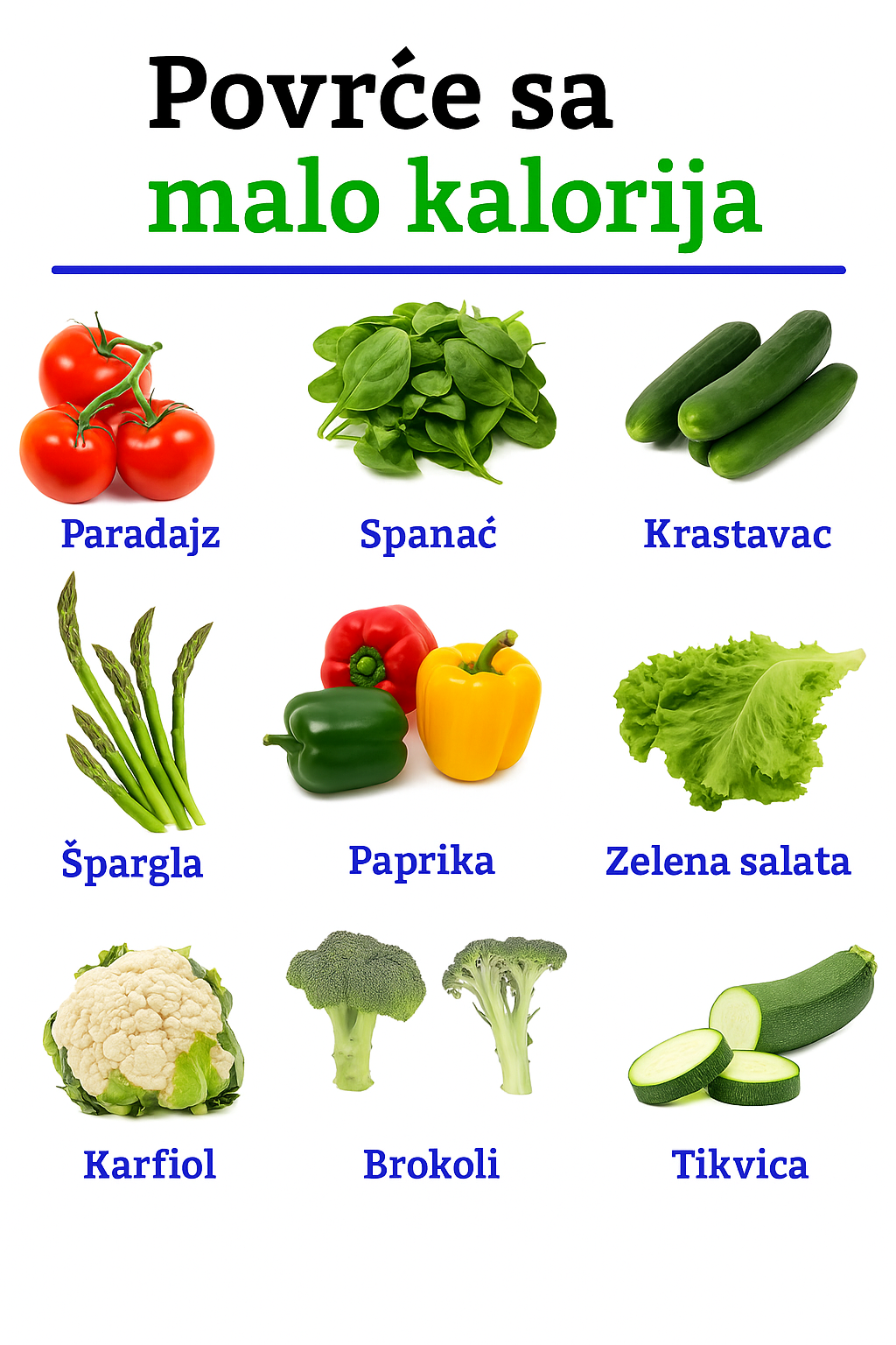 Slika pod nazivom „Povrće sa malo kalorija“ (Povrće sa malo kalorija) prikazuje raznovrsno svježe, hranjivim tvarima bogato povrće koje ne samo da pomaže u održavanju zdrave težine, već i značajno doprinosi općem blagostanju. U nastavku slijedi pregled svakog povrća i njegovih zdravstvenih prednosti:
