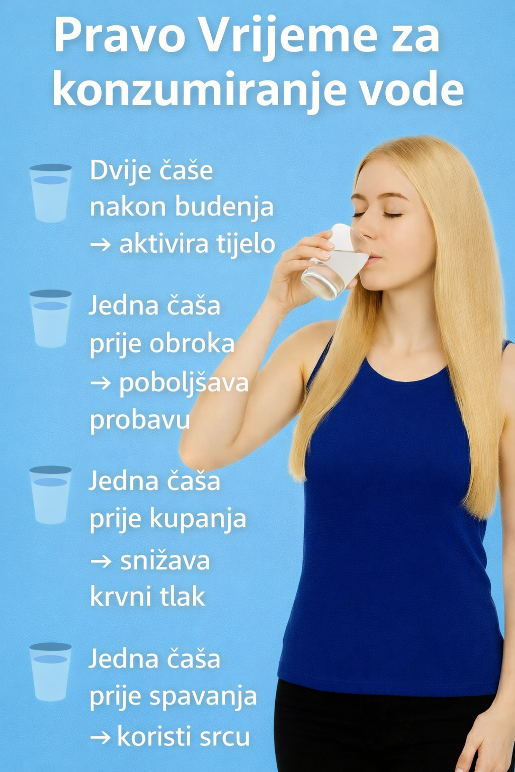 Samo pijenje dovoljne količine vode nije dovoljno — vrijeme je ključno. Integrirajući ove navike u svakodnevni ritam, možete značajno unaprijediti svoje zdravlje, energiju i vitalnost.