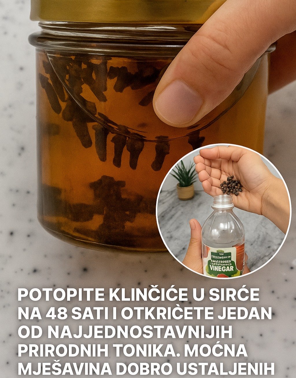 Klinčići su vekovima korišteni kao jedan od najsnažnijih začina za zdravlje. Sirće, posebno sirovo i nefiltrirano poput jabukovog, poznato je po svojim antimikrobnim, detoksikacijskim i probavnim svojstvima. Kada se klinčići namaču u sirćetu 48 sati, nastaje prirodni tonik koji mnoge kulture smatraju “prirodnim antibiotikom”.