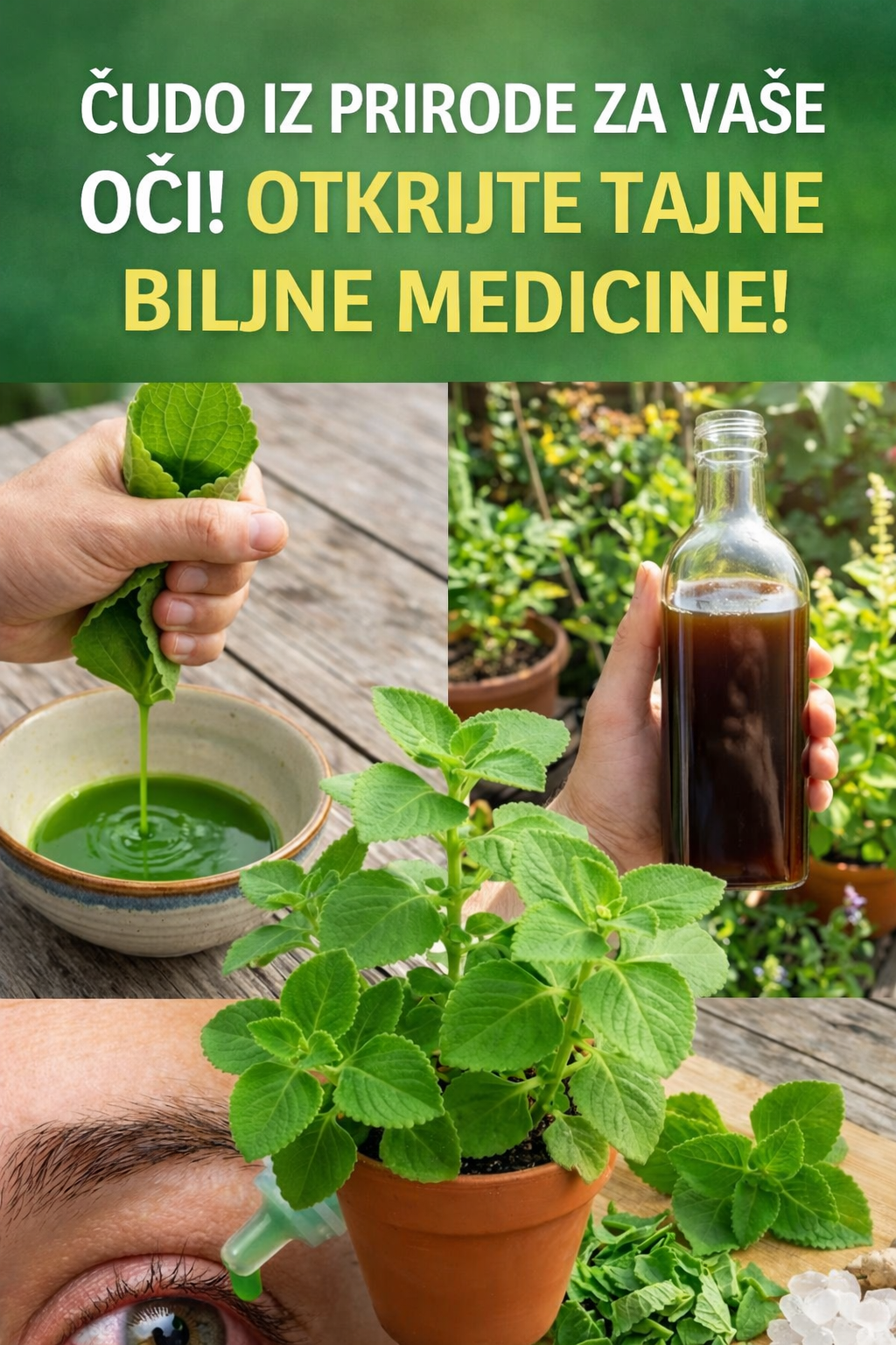 Priroda odavno pruža moćne lijekove za održavanje zdravlja očiju, a biljna medicina igra važnu ulogu u tradicionalnim praksama liječenja. Slika ističe prirodni lijek na biljnoj bazi koji se koristi za njegu očiju, prikazujući svježe zelene listove, biljni ekstrakt i kapi koje se nanose na oči. Ovo predstavlja upotrebu ljekovitog bilja za podršku vidu i ublažavanje problema povezanih s očima.