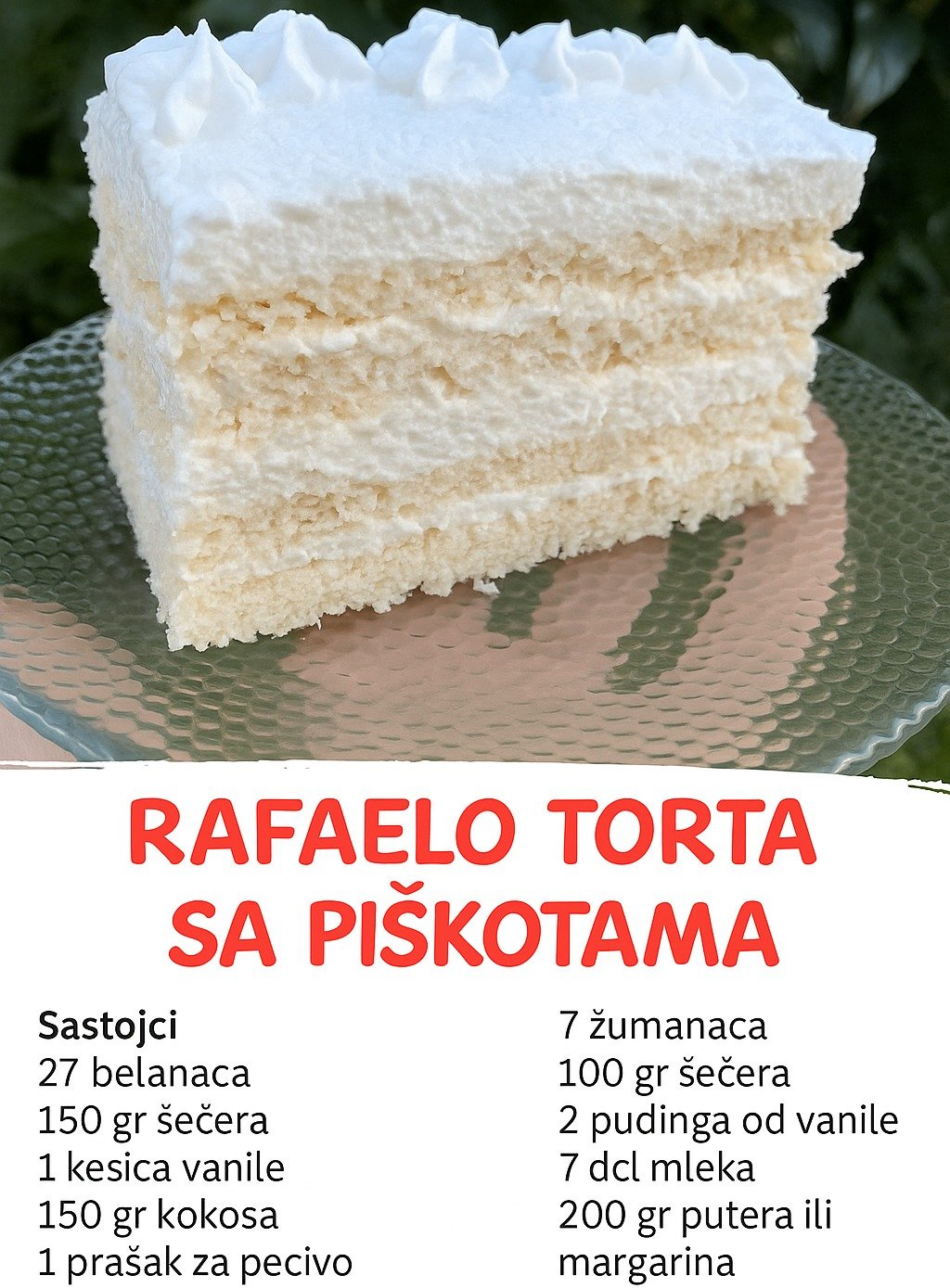 Torta koja se zove Rafaelo jedan je od onih deserta koji izaziva osećaj nostalgije, ali istovremeno donosi i potpuno novo iskustvo u svetu slatkiša. Iako nosi naziv popularnog Rafaelo bombona, ova verzija sa piškotama, kokosom i bogatim filom, donosi sasvim posebnu, ali izuzetno ukusan twist. Priprema ove torte nije previše komplikovana, a njena bogata tekstura i odličan balans ukusa zasigurno će oduševiti sve ljubitelje slatkiša. Ako ste u potrazi za jednostavnim, ali spektakularnim desertom, ova torta će sigurno biti pun pogodak.
