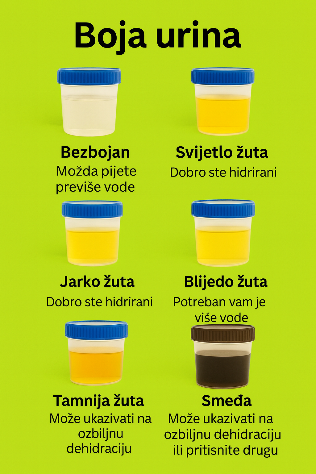 Boja mokraće je jednostavan pokazatelj vašeg statusa hidratacije. Svijetle nijanse obično ukazuju na ravnotežu, dok tamnije nijanse ukazuju na nedostatak tekućine. Vrlo tamna ili smeđa mokraća zahtijeva oprez. Redovito pijenje vode, zdrava prehrana i odgovorna upotreba lijekova pomažu u zaštiti zdravlja bubrega. Ako promjene potraju, neophodna je medicinska procjena.