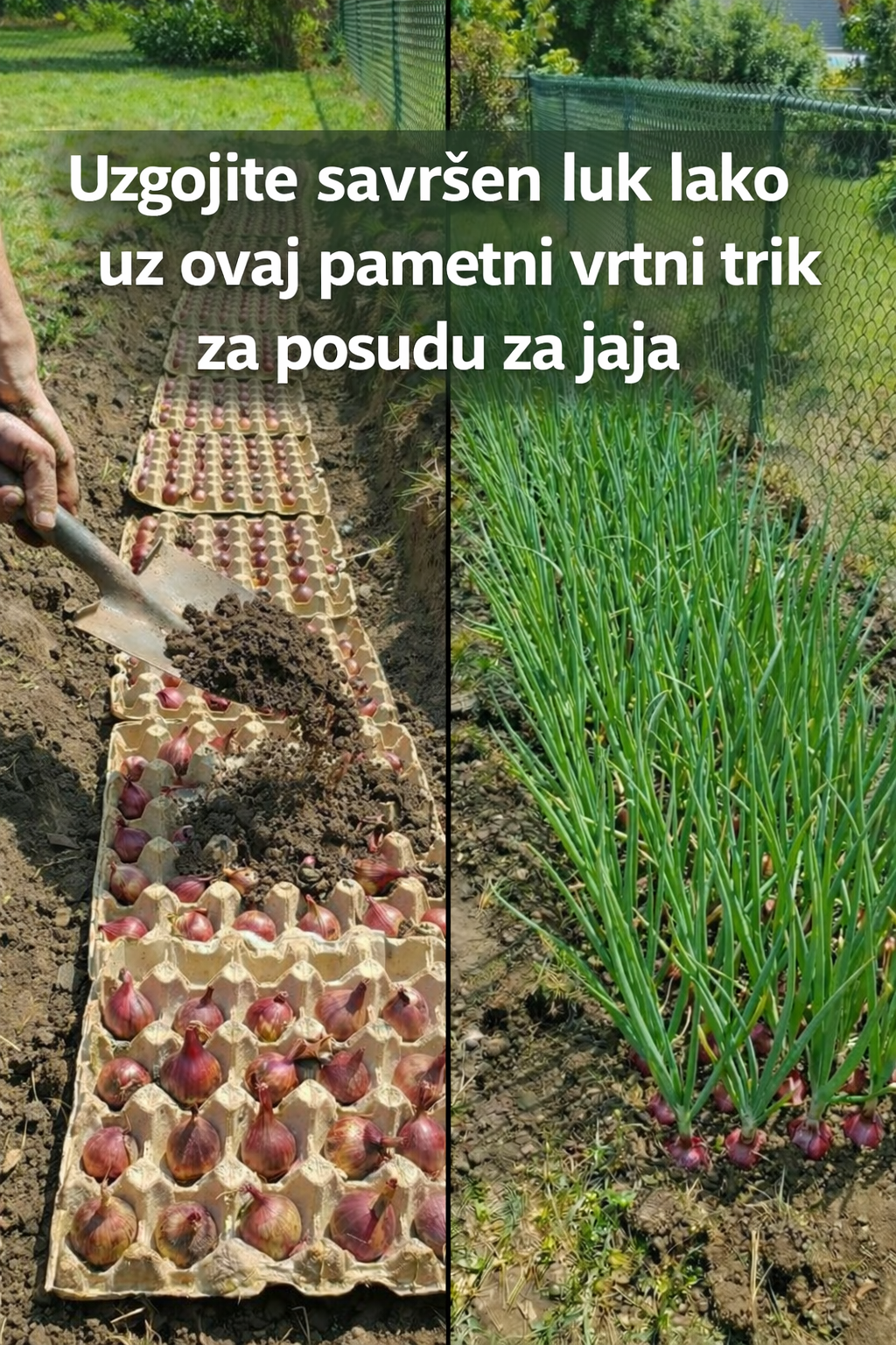 Korištenje papirnih kartonskih podloga za jaja kao “mreže” za sadnju je elegantan način za ravnomjerno raspoređivanje luka, suzbijanje korova i dobijanje uredne gredice poput one na vašim fotografijama. Kartonske podloge djeluju kao biorazgradivi malč i odstojnik – a zatim se raspadaju kako luk raste.
