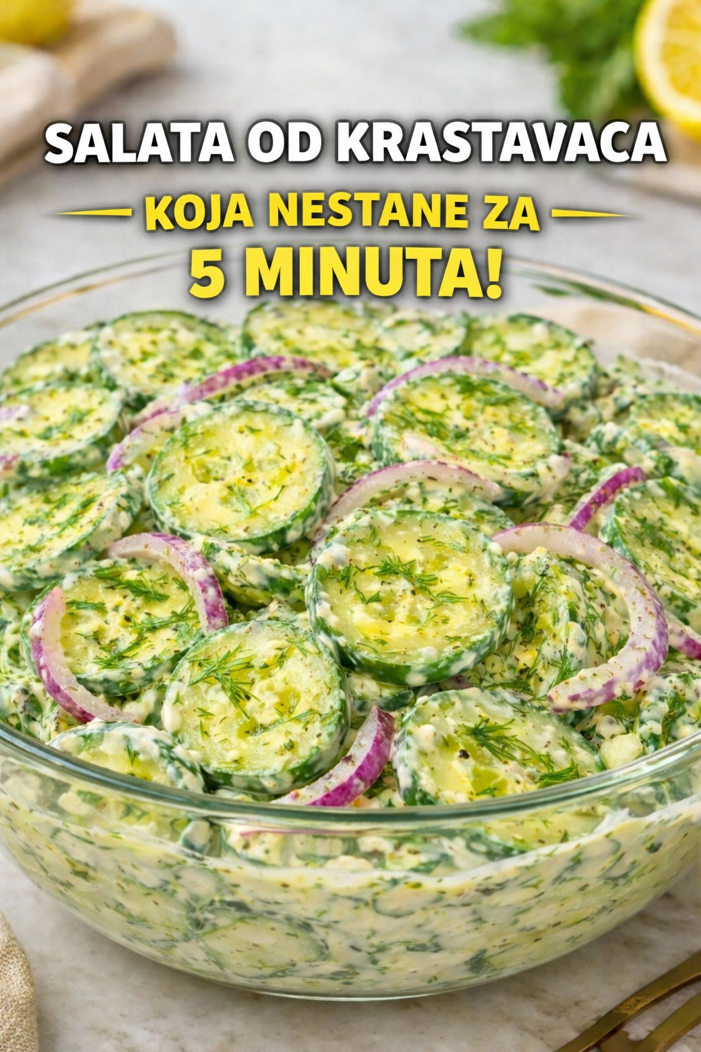 Svježa, kremasta i nevjerovatno osvježavajuća – ova salata od krastavaca je savršen prilog za svaki obrok. Sa hrskavim kriškama krastavca, crvenim lukom i ukusnim kremastim preljevom od kopra, ovaj jednostavni recept je lagan, zdrav i gotov za nekoliko minuta. Nije ni čudo što tako brzo nestaje sa stola!