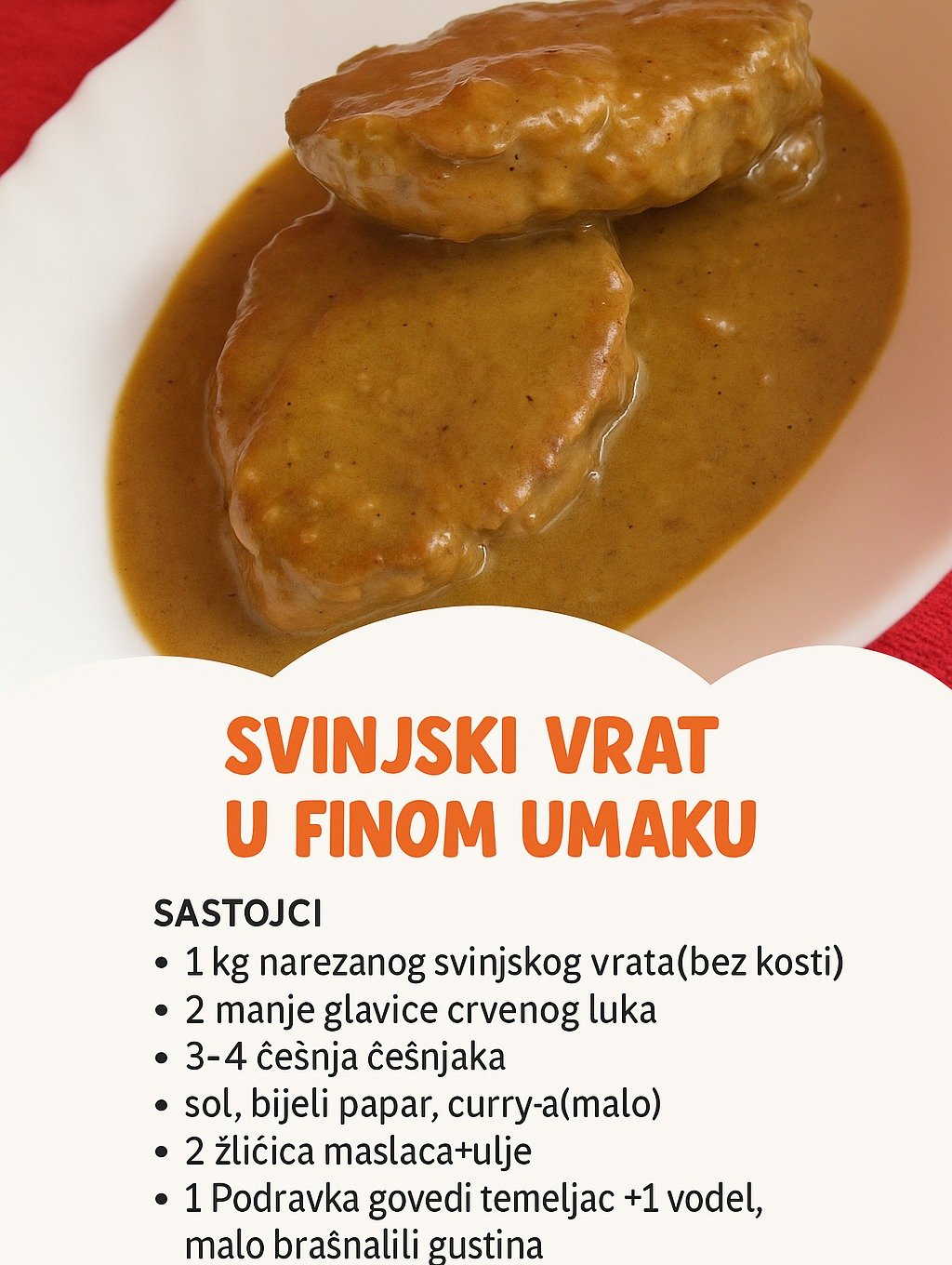 Svinjski vrat u finom umaku je pravi primer kako jednostavni sastojci, uz pažljivu pripremu, mogu da postanu jelo koje se pamti. Uz sočno mesoaromatičan sos i bogate ukuse začina, ovo jelo donosi toplinu domaće kuhinje na vaš sto. Idealno je za porodične ručkove, nedeljne gozbe ili posebne prilike kada želite da impresionirate goste.
