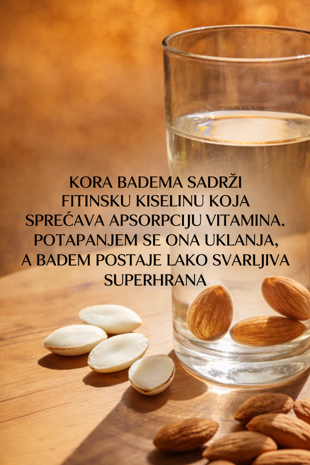 Večeras uzmite 4 sirova badema (ne pečena, ne slana). Ubacite ih u malu čašu ili šoljicu. Prelijte ih čistom vodom tako da budu potpuno potopljeni. Ostavite ih da stoje na sobnoj temperaturi preko noći (minimalno 8 sati).