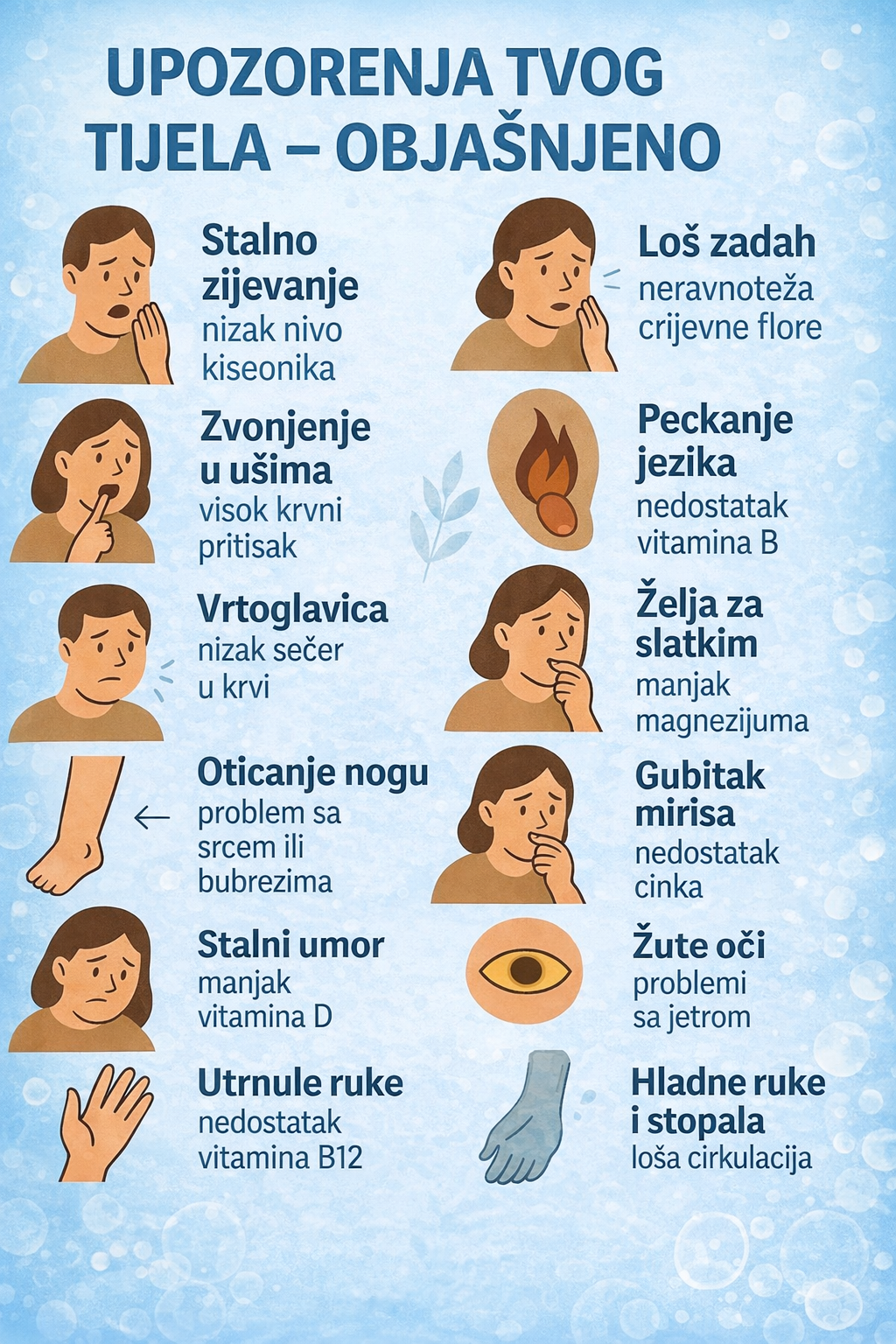 Tijelo uvijek govori — samo ga treba pažljivo slušati. Ovi znakovi ne znače uvijek ozbiljan problem, ali ukazuju na to da organizmu nešto nedostaje ili da treba dodatnu brigu. Ako se simptomi ponavljaju, najbolje je potražiti savjet ljekara.