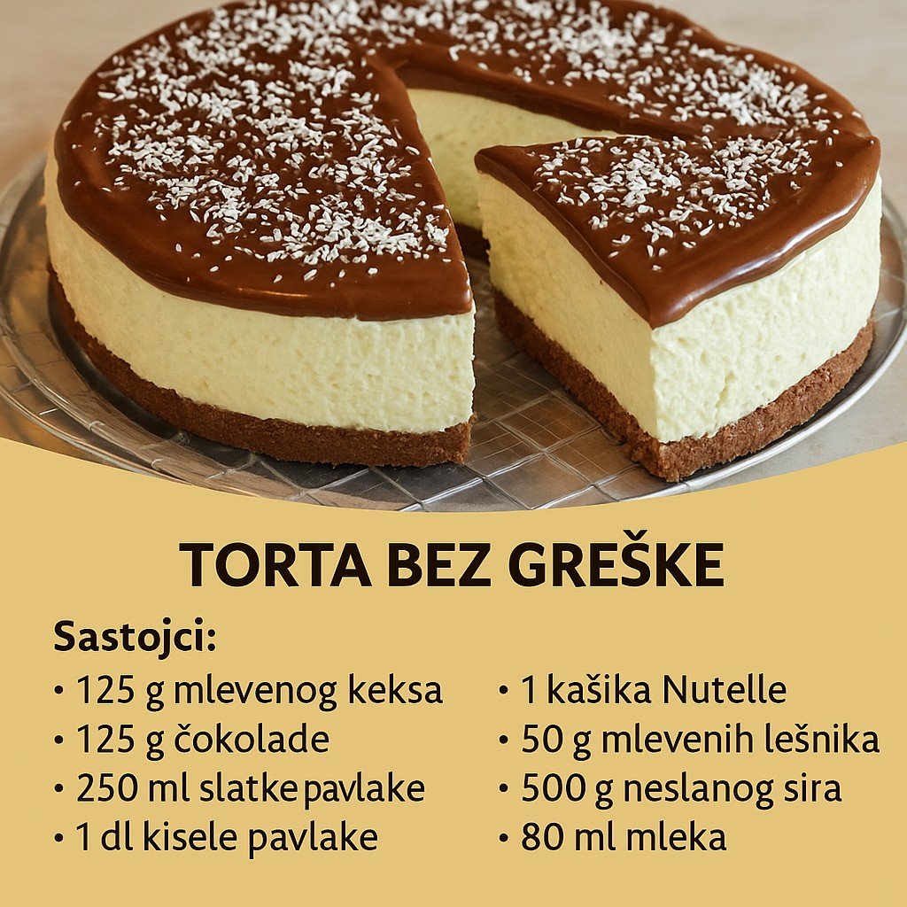 Odmah preliti preko kreme od sira. Ako volite intenzivniji ukus lešnika, preko nougat kreme odmah posuti mlevene pečene lešnike. Ostaviti preko noći (najmanje 6 sati) u frižideru tankim, dugačkim nožem proći između torte i obruča. Ukloniti obruč.