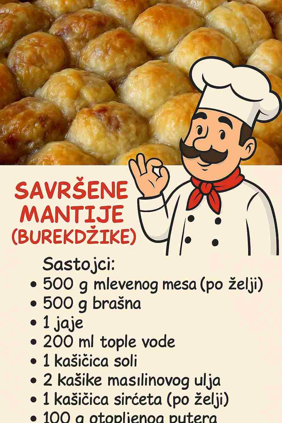 Burekdžike, poznate i kao mantiije, su ukusan i sočan tradicionalni recept koji potiče iz Balkana, a omiljeni su na mnogim prostorima. Služene kao glavno jelo ili predjelo, ove pite sa mesom i bogatstvima začina u savršenom su skladu sa hrskavom koricom. Savršene za sve ljubitelje tradicionalnih jela, burekdžike su pravo zadovoljstvo za nepce i jednostavne za pripremu.