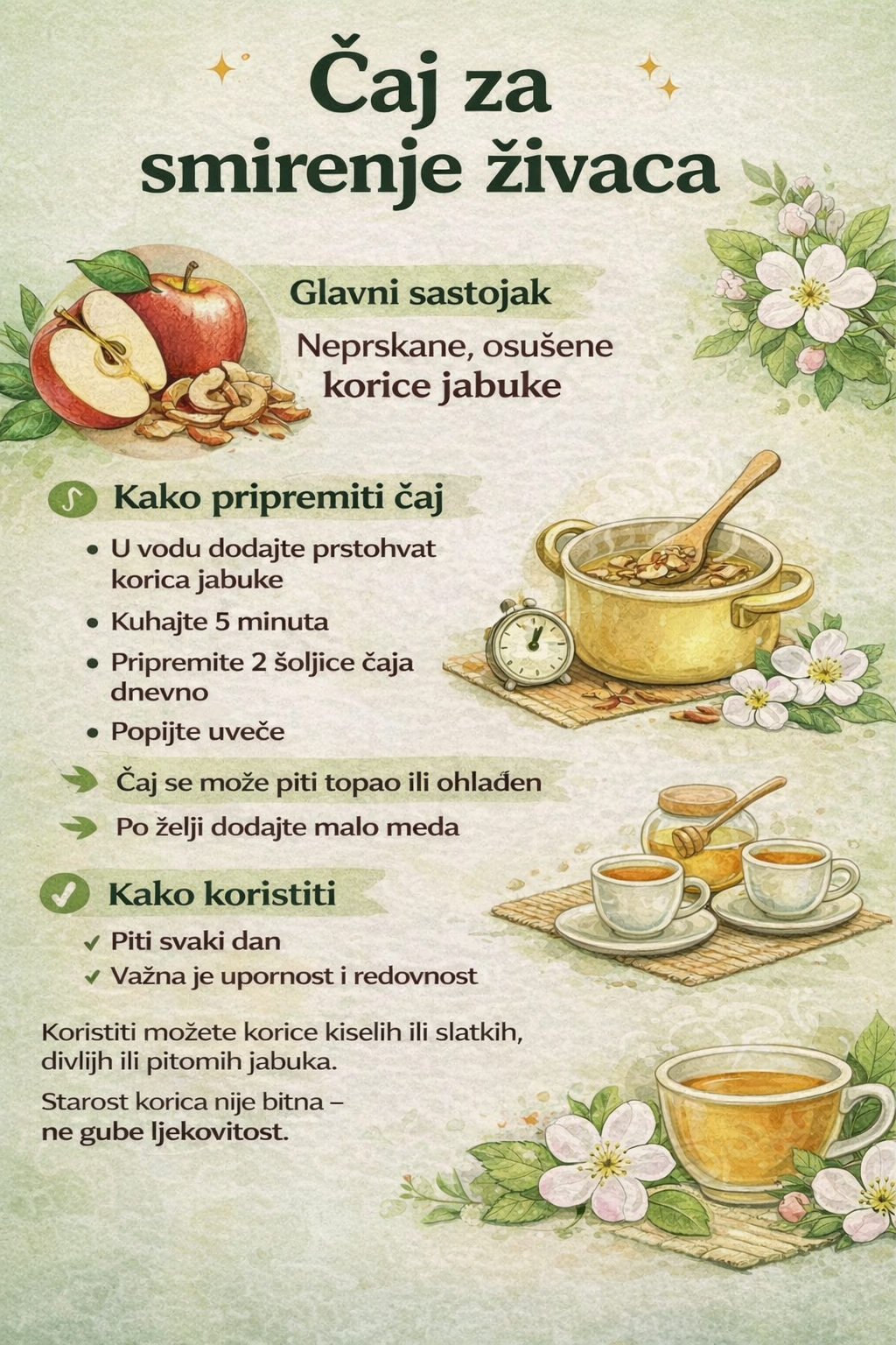 Ukoliko imate jače simptome nervoze i oslabljene živce, te teže spavate, potrebno je da osim čaja od korice jabuke pravite svaki dan i čaj od zdravlja (Geranium macrorrhizum). On se pravi tako što uzmete prstohvat zdravca i prelijete ga sa 1,5 dcl vrele vode i ostavite da odstoji 10 minuta. Čaj pijete svaku noć ohlađen gutljaj po gutlja u kombinaciji sa čajem od jabukove kore.