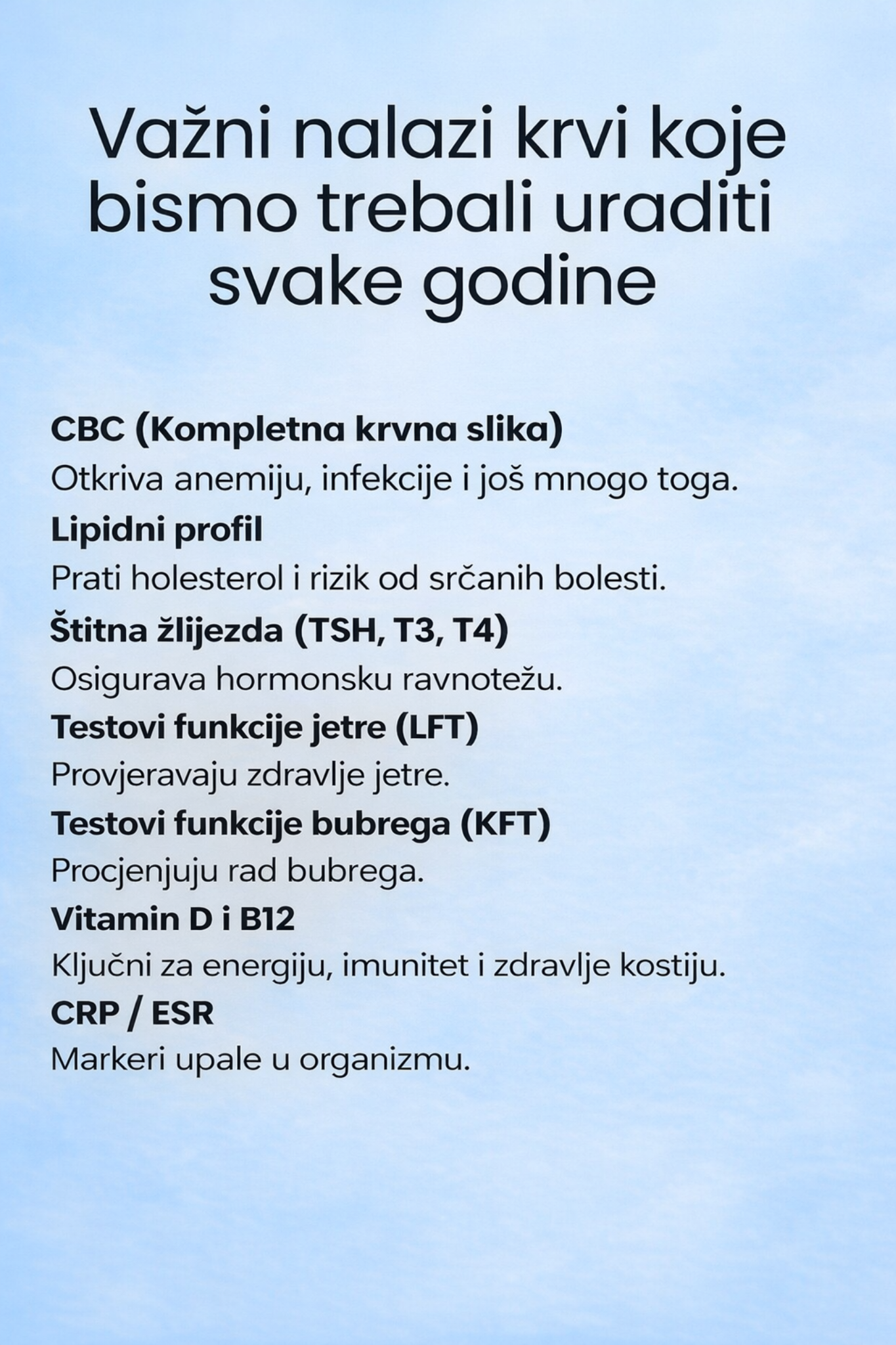 Redovne krvne pretrage igraju vitalnu ulogu u održavanju općeg zdravlja i sprječavanju ozbiljnih bolesti. Mnogi zdravstveni problemi razvijaju se tiho, bez jasnih simptoma, a rutinske pretrage krvi pomažu u ranom otkrivanju problema – kada ih je najlakše liječiti. Testovi istaknuti na slici predstavljaju najvažnije pretrage krvi koje ljekari preporučuju barem jednom godišnje.