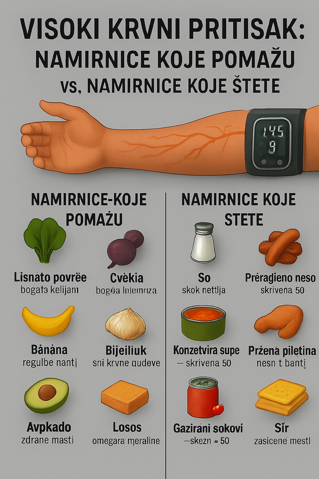 Visok krvni pritisak (hipertenzija) jedan je od najčešćih zdravstvenih problema današnjice. Iako na njega utiču genetika, stres, fizička aktivnost i životne navike, prehrana igra izuzetno važnu ulogu. Slika jasno prikazuje razliku između namirnica koje mogu doprinijeti zdravlju krvnog pritiska i onih koje mogu pogoršati.