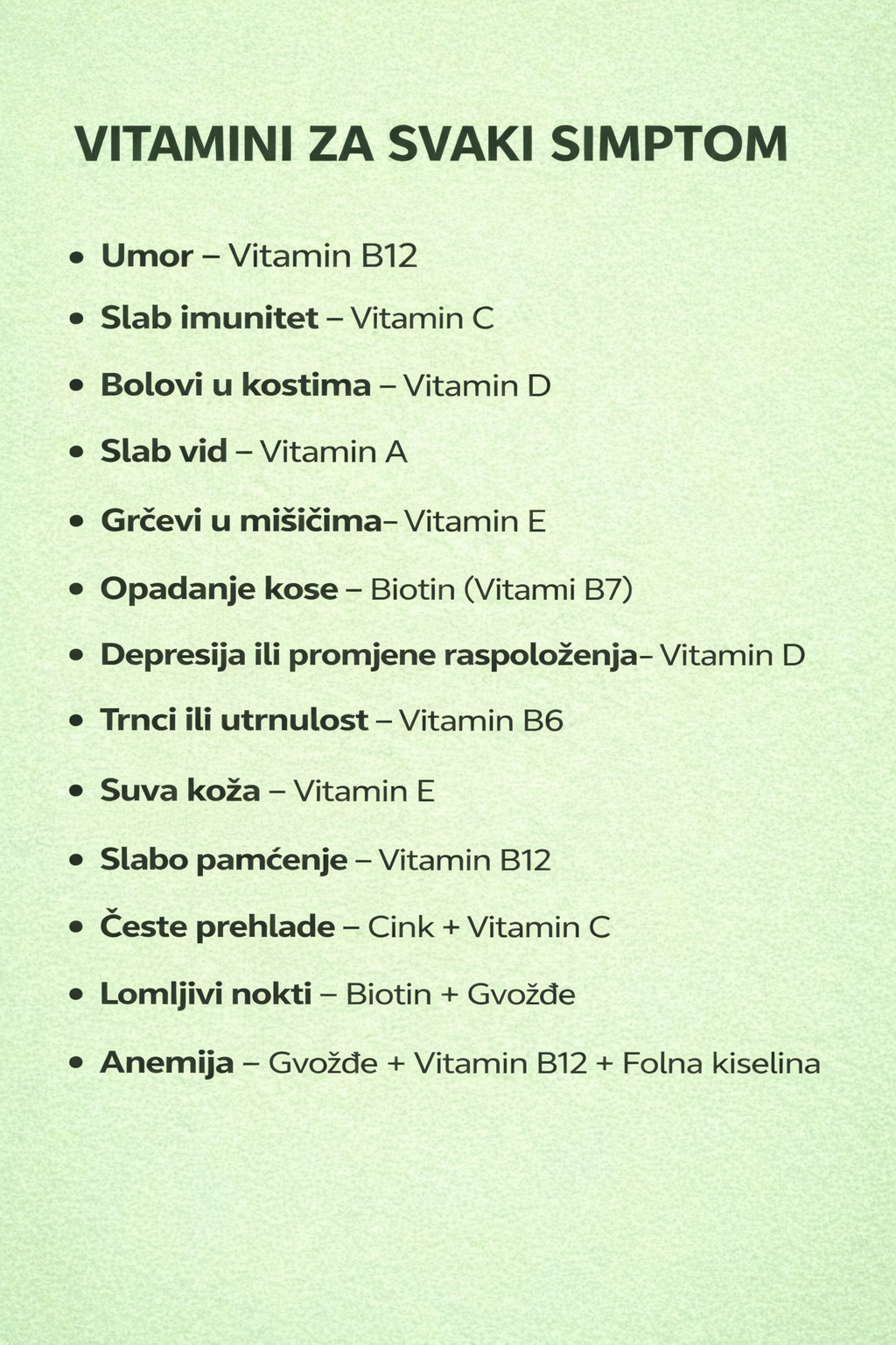 Anemija zahteva posebnu pažnju jer uključuje kombinaciju gvožđa, vitamina B12 i folne kiseline.