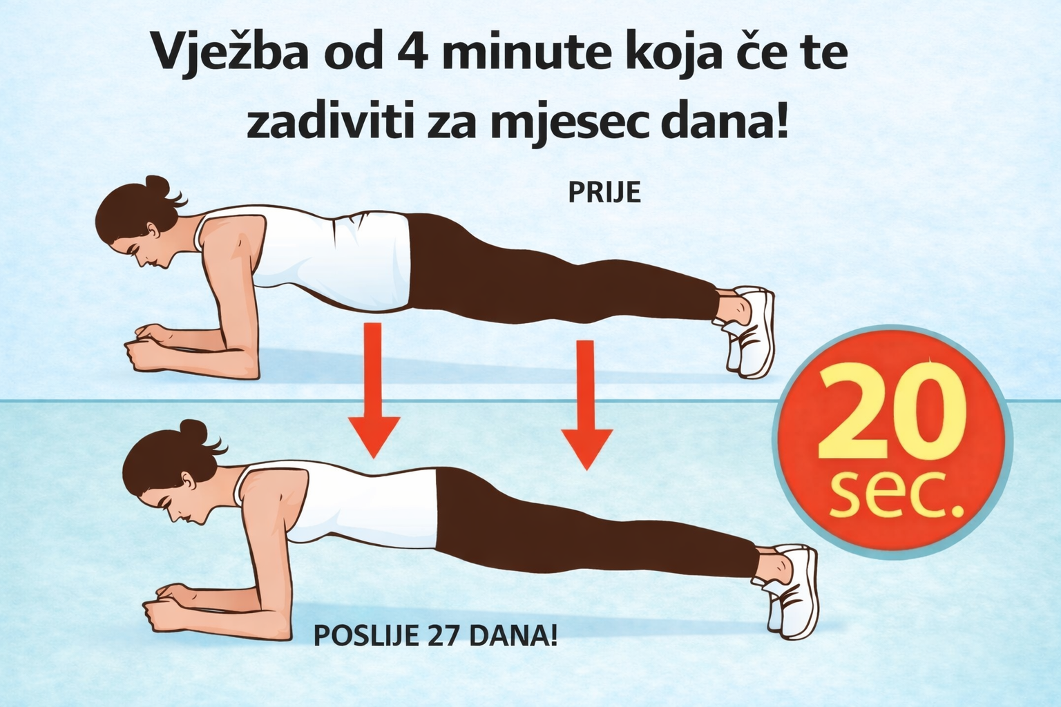 Ako smo vam rekli da postoji način na koji potpuno preobrazite svoje tijelo za samo 4 minute, šta možete učiniti? Možda ovo zvuči previše dobro da bude istina za vas? Samo nastavite čitati i vidjećete o čemu se radi. To možete učiniti tako da napravite samo jednu jednostavnu vježbu – Plank. Međutim, ako želite imati sjajno tijelo, morate pronaći unutrašnju snagu da biste svaki dan napravili dasku. Plankom ćete takođe povećati izdržljivost i energiju.