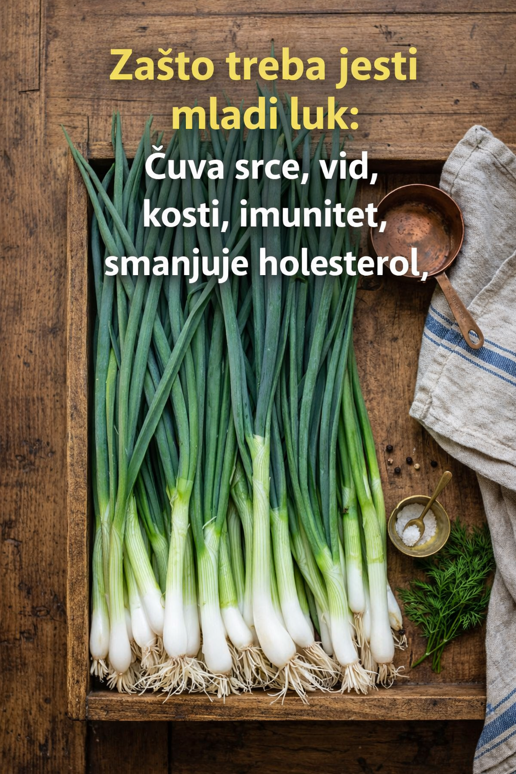 Mladi luk ima veliki broj supstanci koje snižavaju loš holesterol u krvi. Njegov zeleni deo veoma je zdrav i, pored toga što pomaže da se smanji holesterol, dobar je i za vraćanje povišenog šećera u normalu.
