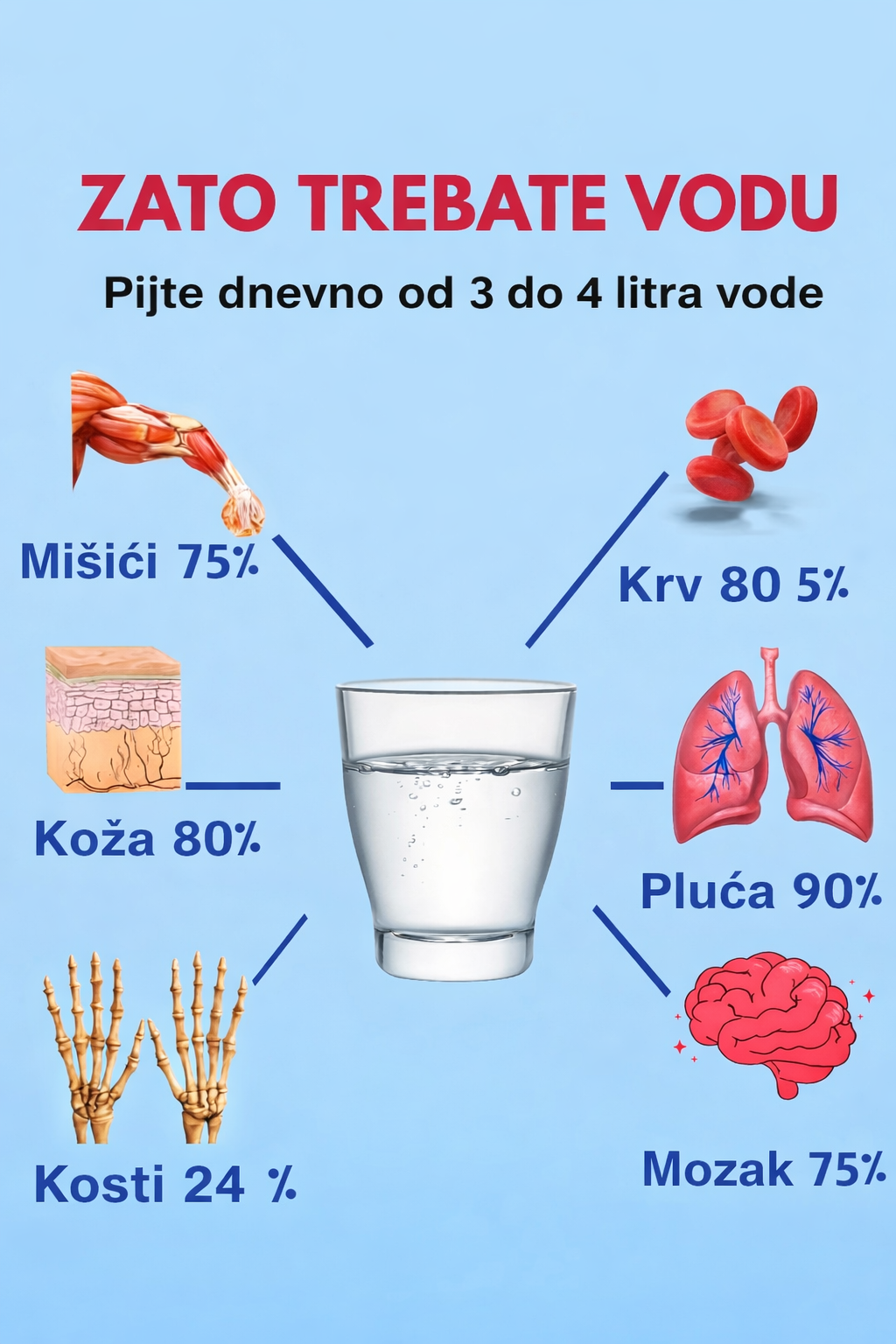 Iako se često činim i jednostavnim, voda obično utiče na sve — od raspoloženja, koncentracije i varenja, pa do zdravlja kože, mišića i kostiju. Čak i mala dehidracija može poremetiti ove procese, zato je redovan unos vode ključa za dobro zdravlje.