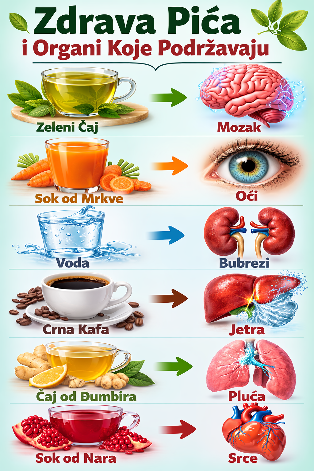 Održavanje dobrog zdravlja često počinje jednostavnim svakodnevnim navikama, a jedna od najlakših navika je odabir pravih napitaka. Prirodni napitci poput biljnih čajeva, svježih sokova i vode pružaju esencijalne hranjive tvari koje pomažu u podršci različitim organima u tijelu. Slika ističe nekoliko zdravih napitaka i organe koje obično povezuju s podrškom.
