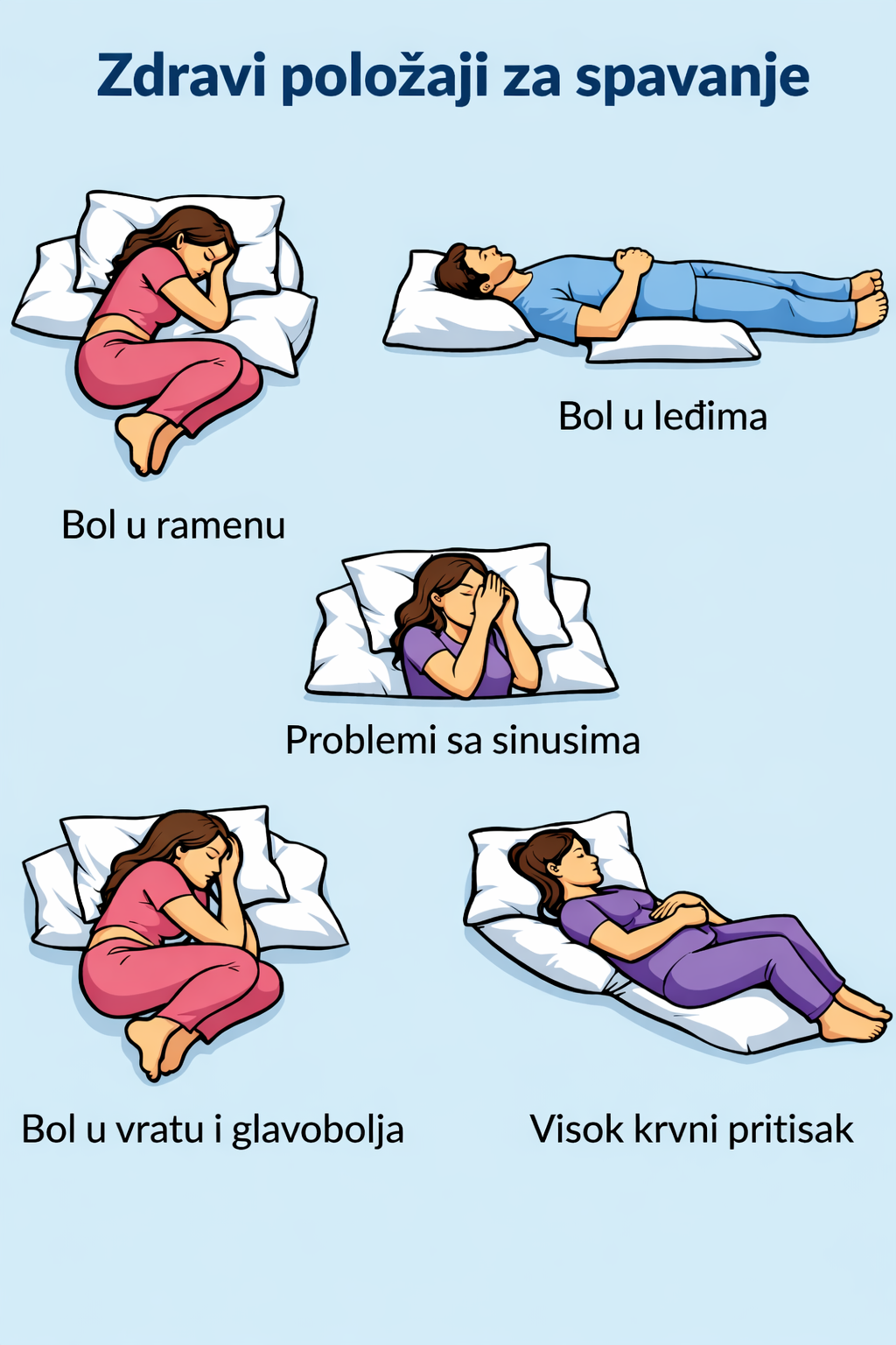 Ovi položaji spavanja mogu podržati udobnost i poboljšati simptome, ali nisu zamjena za medicinski tretman. Ako imate hronične bolove ili zdravstvena stanja, konsultujte se sa zdravstvenim radnikom za odgovarajuće smjernice.