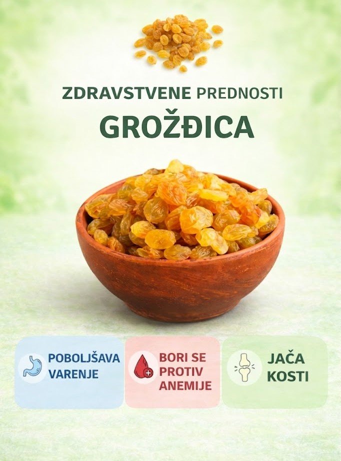 Dodavanje samo male šake grožđica u vašu dnevnu rutinu može napraviti veliku razliku. Bilo da ih jedete same, miješate ih u doručak ili ih dodajete u deserte, grožđice su jednostavan i prirodan način za poboljšanje vašeg zdravlja.