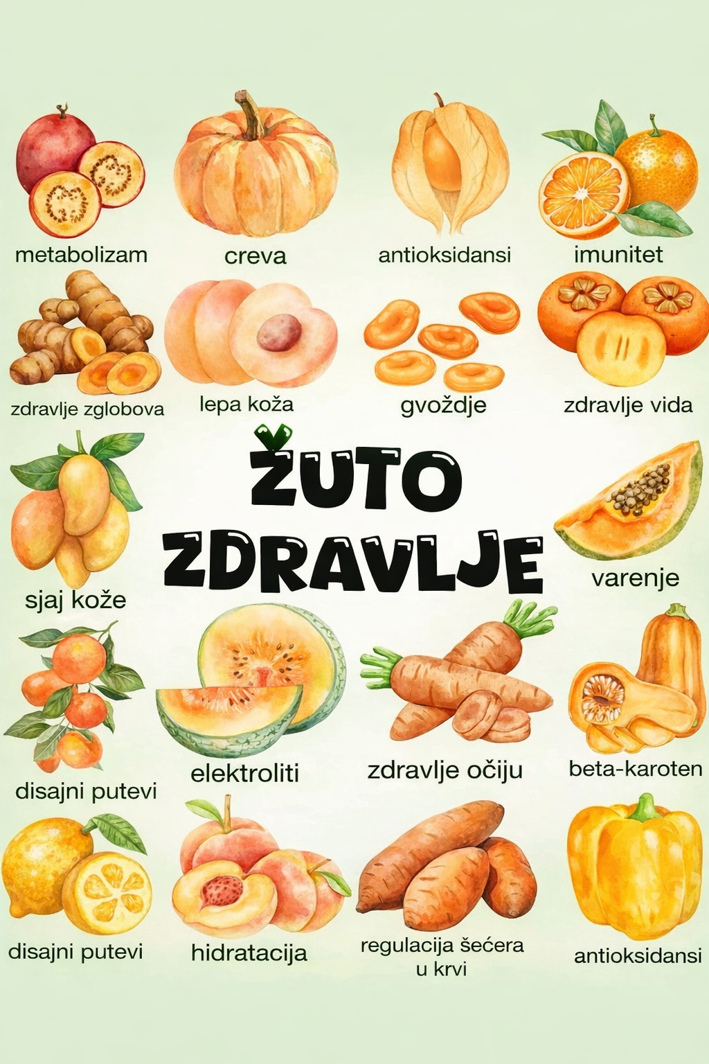 Uključivanje žutog voća i povrća u vašu prehranu jednostavan je, ali snažan način za poboljšanje cjelokupnog zdravlja. Od jačanja imuniteta i probave do podrške zdravlju zglobova, kože i očiju, ova živahna hrana prirodni je izvor vitalnosti. Obavezno uključite razne žute namirnice poput bundeve, mrkve, manga, dinja i citrusnog voća u svoje svakodnevne obroke kako biste uživali u njihovim raznolikim prednostima.